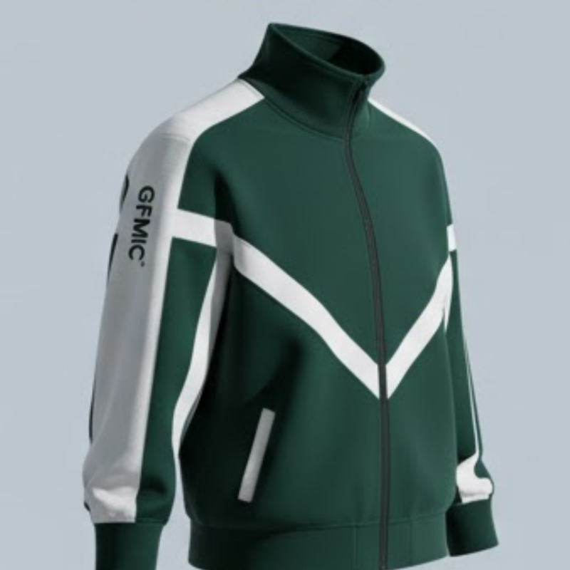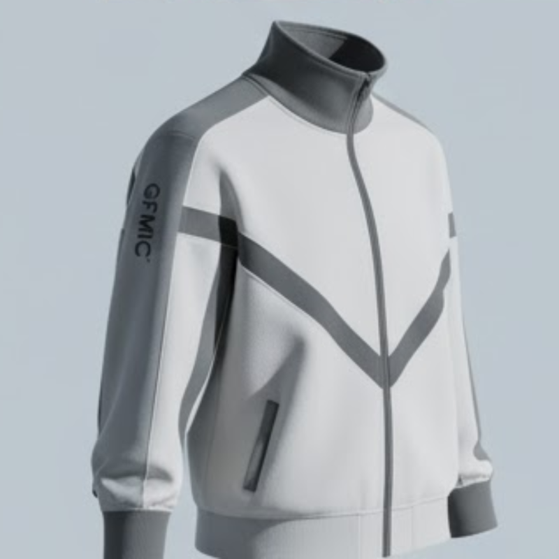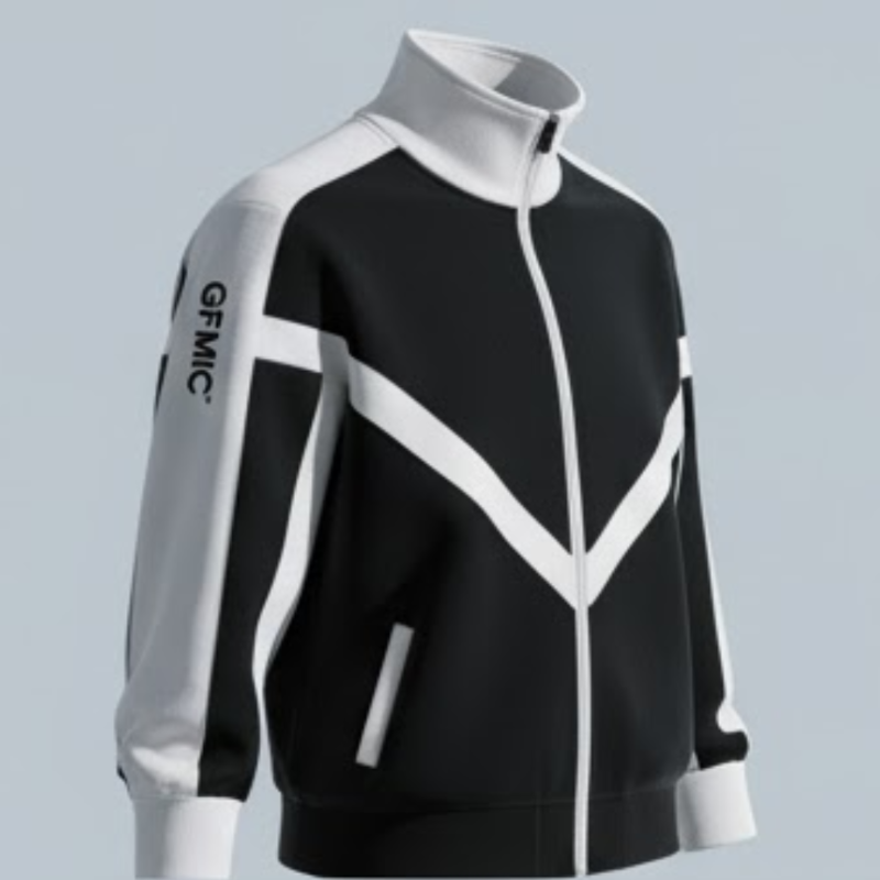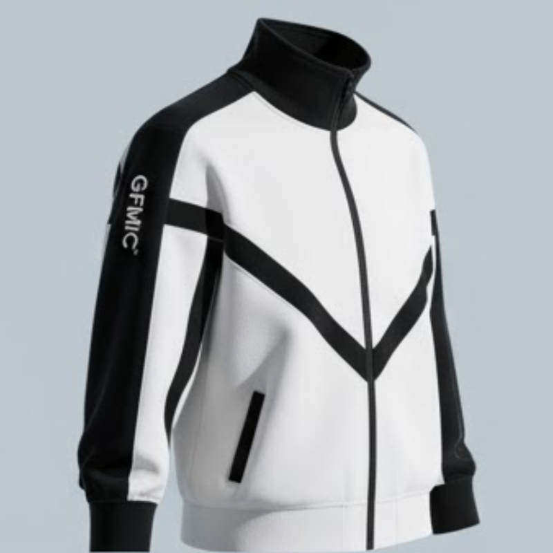 This premium jacket stands out with its bold, angular "chevron" color-blocking in contrasting white and blue. Crafted from a structured, comfortable fabric, it features a full-zip front that leads up to a protective, ribbed funnel neck. A vertical GFMIC logo printed on the sleeve adds a unique, modern touch, making this a standout piece for any wardrobe.