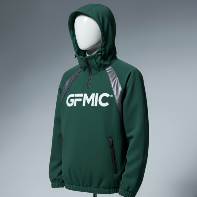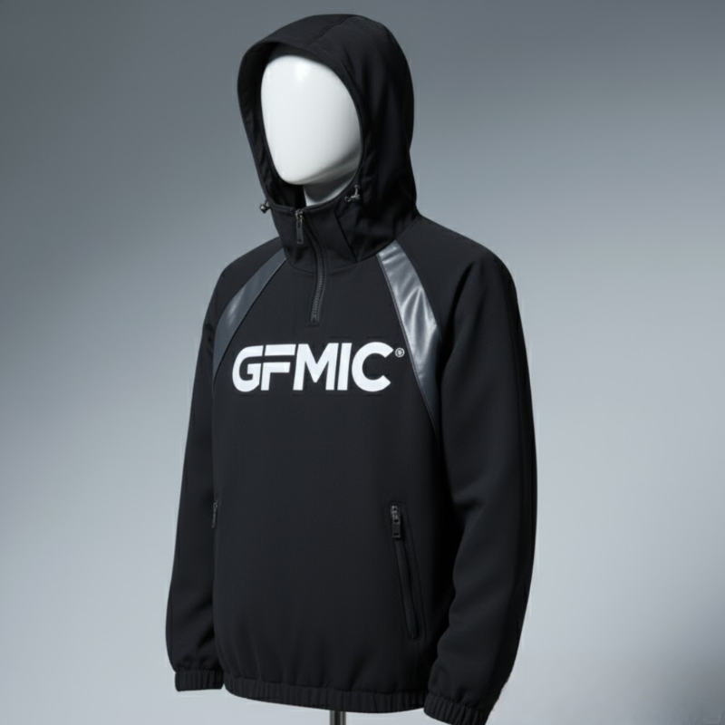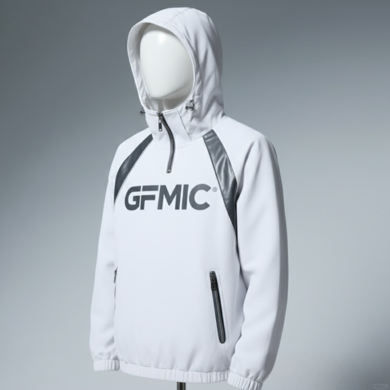 Stay active in any weather with the GFMIC Performance Anorak. This versatile pullover jacket is crafted from a lightweight, technical fabric designed for mobility and protection. It features a high-neck, quarter-zip closure and an adjustable hood for customizable coverage. The design is marked by contrasting shoulder panels and a bold GFMIC logo across the chest. A secure vertical zip pocket provides convenient storage for your essentials, while elasticated cuffs and hem ensure a snug fit.